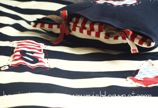 Dla wzmocnienia efektu, oprócz pokazanych wcześniej metek, zrobiłam dwukolorowe obramowanie, tzn szyłam dwoma kolorami nitek, na stronie granatowej - białą, a na stronie w paski - czerwoną :) Uważam, że diabeł tkwi w szczegółach :)